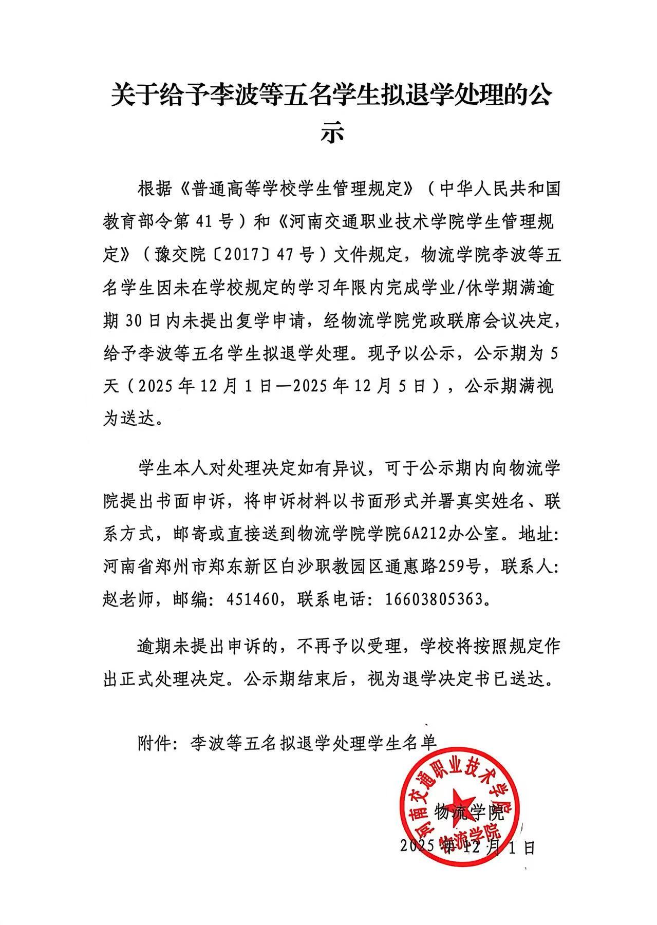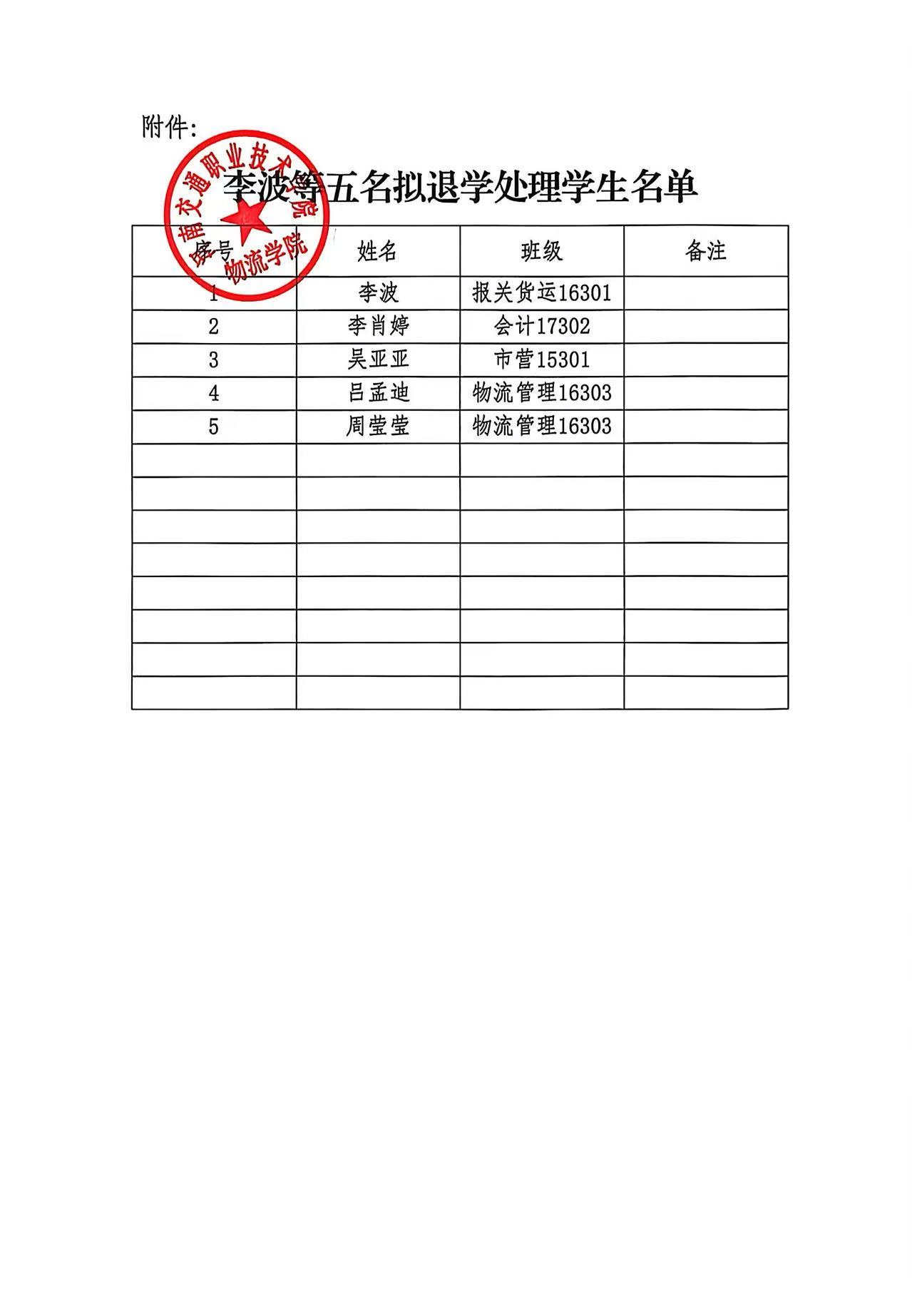 关于给李波等五名学生拟退学处理的公式