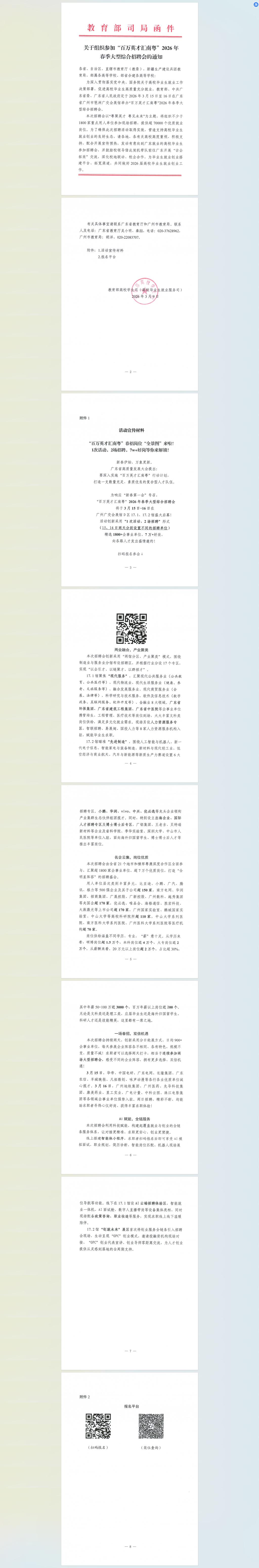 教育部、中共广东省委、广东省人民政府定于2026年3月15日至16日在广州市琶洲广交会展馆举办“百万英才汇南粤”2026年春季大型综合招聘会,本次招聘会将组织不少于1800家重点用人单位参会,提供超70000个优质就业岗位。请各院系做好活动宣传,结合专业特色动员有意向赴粤就业的毕业生参加招聘会,并鼓励院系领导借此契机带队前往开展“访企拓岗”交流,深化校企合作。活动安排详见通知。